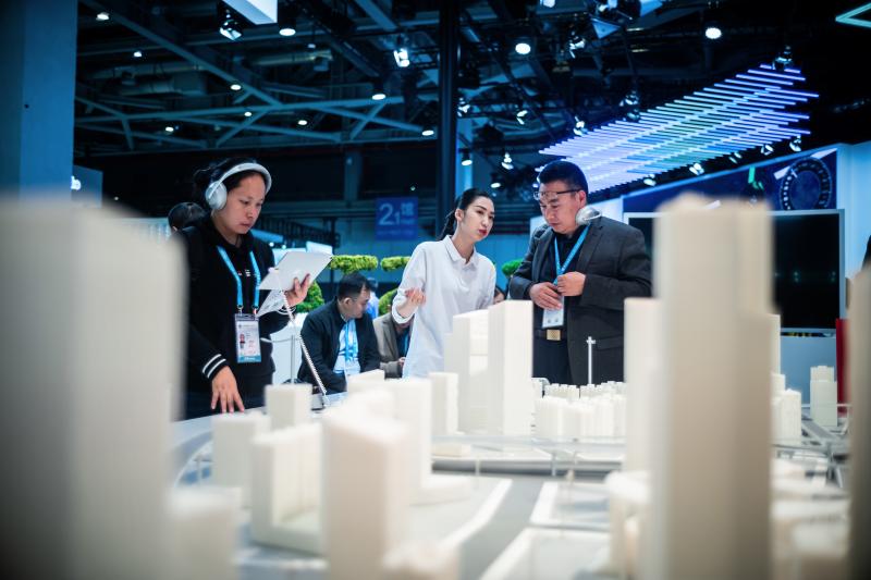 白色建筑群是3D打印的产物,而观众通过耳机和平板,可以在AR(现实增强)技术的帮助下,通过虚拟画面和现实沙盘的交互,看到充满科幻气息的汽车哎未来都市的在沙盘上奔驰。